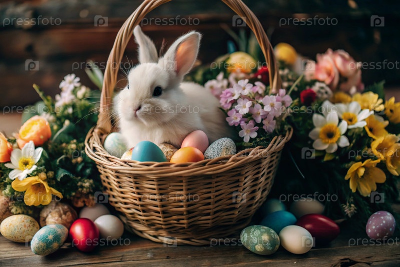 Баннер. пасхальный кролик в плетеновой корзине, наполненной красочными пасхальными яйцами. концепция весенних праздников Пасхи