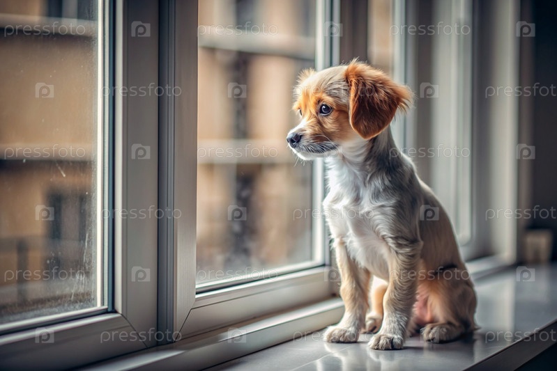 Маленький щеночек смотрит в окно и ждет своего хозяина