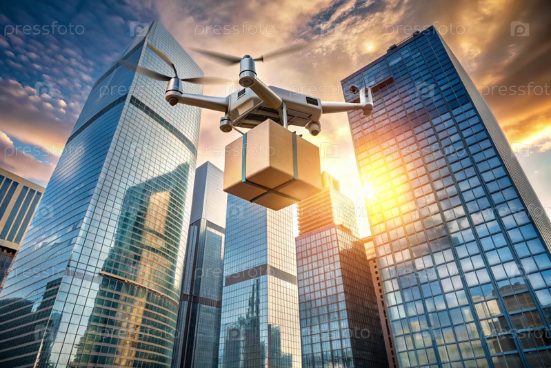 Технология будущего. Дрон доставки несет картонную коробку для человека на веревке. Дрон доставки летает между современными небоскребами. Концепция развития доставки товаров