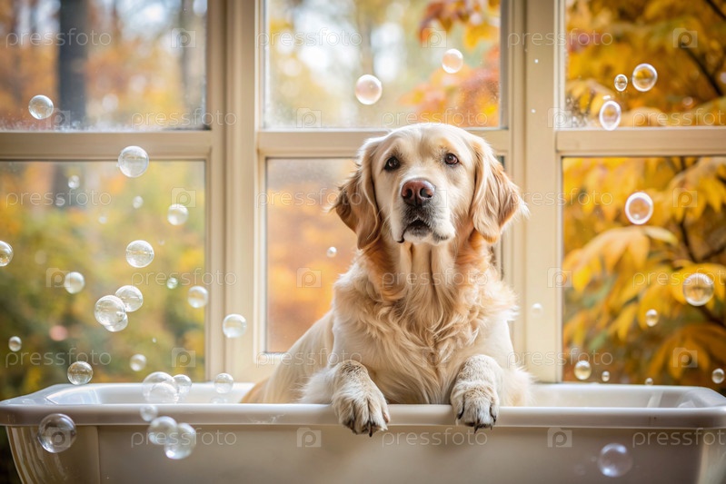 Золотой ретривер купается в пузырьковой ванне. Помыть собаку. Концепция ухода за домашними животными