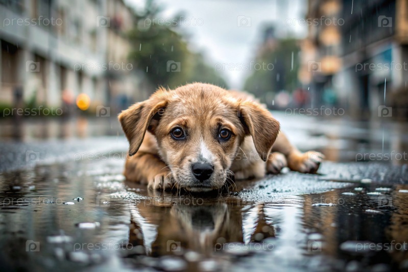 блуждающее животное. мокрая, грустная, брошенная, голодная щенка лежит в луже под дождем. убежище, спасение, благотворительность, пожертвования бездомным животным