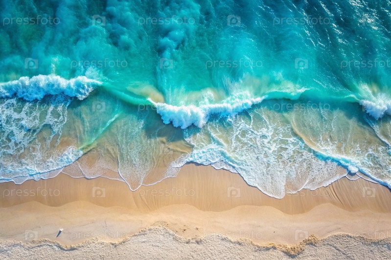 Концепция отдыха и путешествий. Красивый фон. Вид сверху на белый песчаный пляж и пенообразная волна бирюзового океана