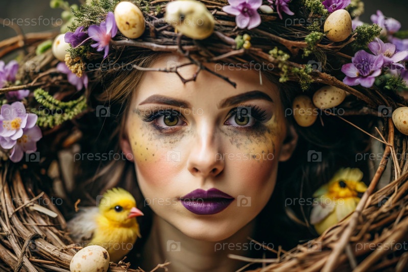 Творческий баннер для салона красоты. Профессиональный гримёр, стилист и парикмахер. Весенняя женщина с вечерним макияжем, цветами, птицами и гнездом на голове. Индустрия красоты