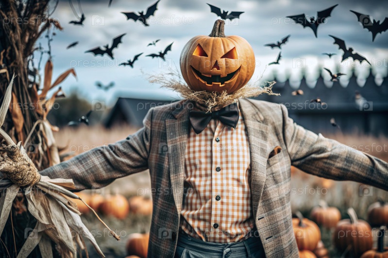 Концепция Хэллоуина. Ужасная. Страх. Устрашающий богий с тыквенной головой, квадратной рубашкой и бабочкой. Баннер, открытка