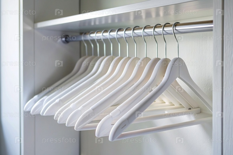 Закрытие белых вешалок на белом шкафу. концепция порядка и хранения в доме