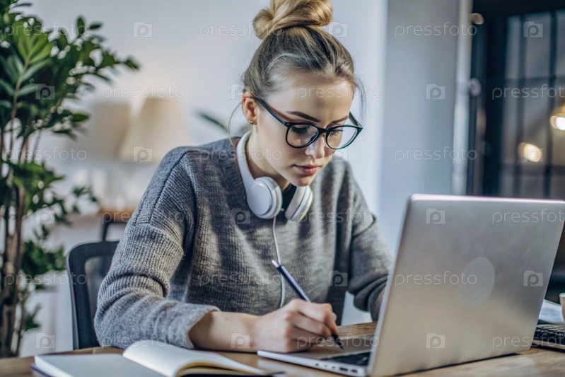Молодая женщина фрилансер в очках и наушниках работает на ноутбуке или делает покупки в интернет-магазине