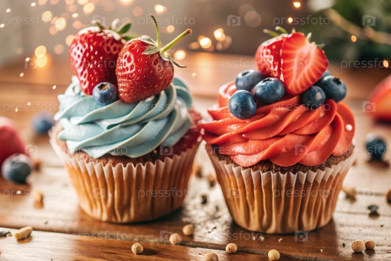 Вкусные красочные кексы со земляницами и чернилами. праздничный кекс, который идеально подходит для веселых торжеств. счастливого дня рождения