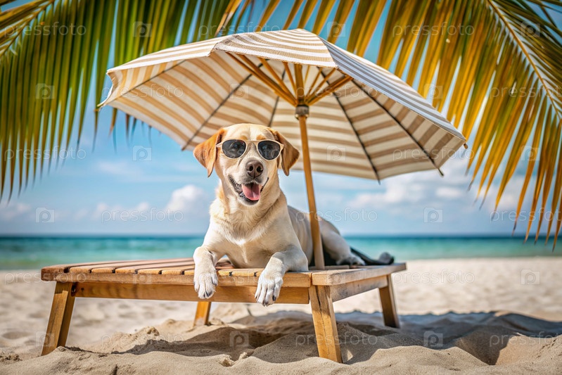 Счастливая собака на пляже в солнцезащитных очках лежит на деревянном шезлонге. концепция курортного отдыха с домашними животными