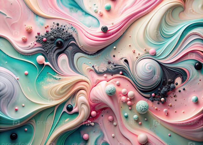 Абстрактный, мечтательный акварельный фон с волнами, полосами, жидкими потоками розового, синего и черного цвета и жемчужинами