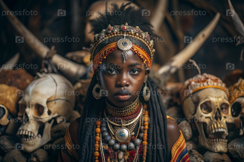 Красивая африканская девушка в традиционном национальном костюме. с костями. портрет символизирует традиции, культуру и красоту африканского народа