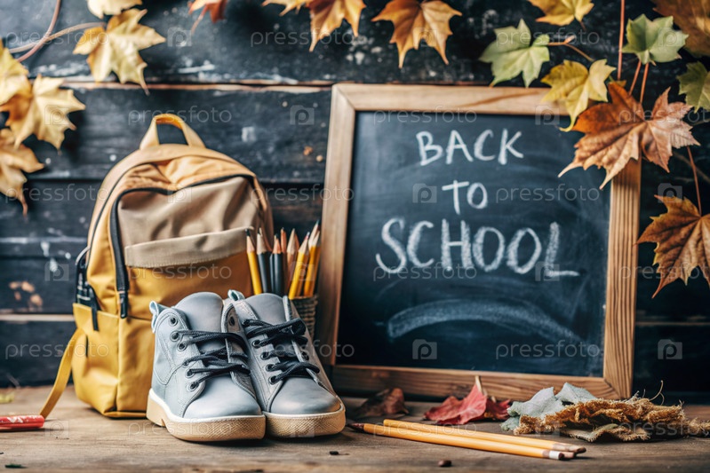 Праздник приходится на 1 сентября. Рюкзак, кроссовки и карандаши. Знак 'Возвращение в школу' на доске. Концепция нового учебного года в школе. Давайте вернемся в школу. День осенних знаний