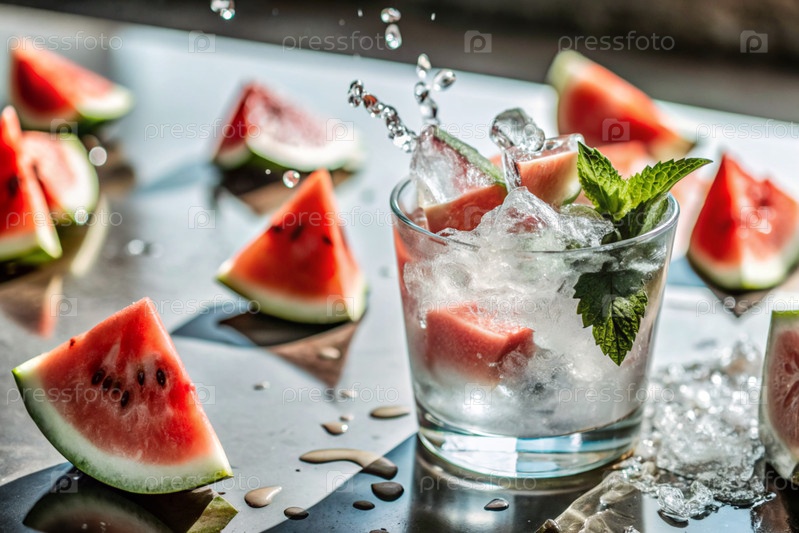 Свежий вкусный арбузный лимонад, мята, кубики льда и кусочки арбуза. летний освежающий напиток