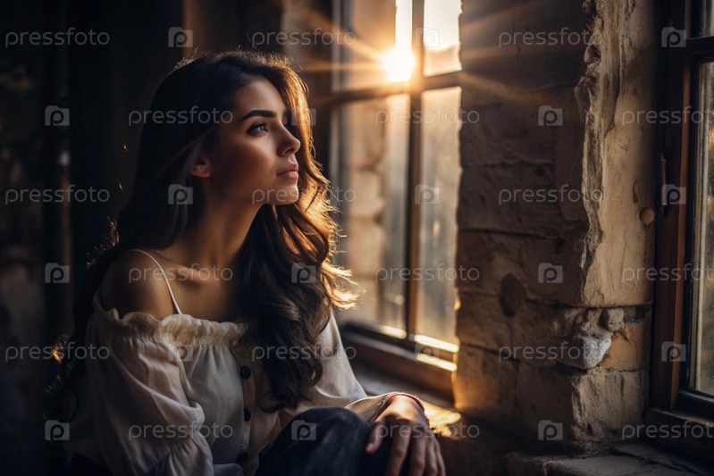Портрет красивой девушки с кудрявыми волосами у окна старого дома, в котором светит теплое яркое солнце. Романтическое изображение. Одиночество, пустота и ожидание