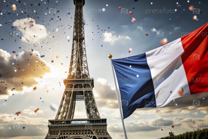 14 июля - Национальный день Франции. Государственный флаг Франции на Эйфелевой башне. Триколор. Концепция Олимпийских игр во Франции 2024