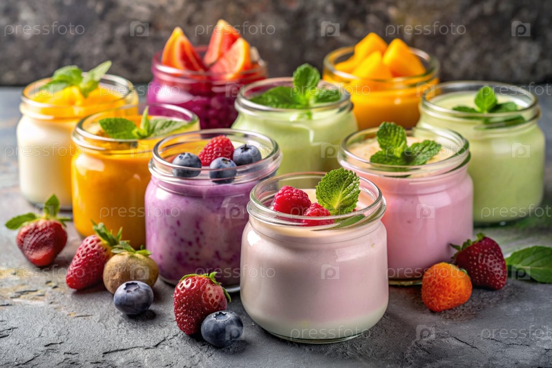 Разнообразный домашний йогурт с различными свежими ягодами и фруктами в стеклянных банках на стильном сером фоне