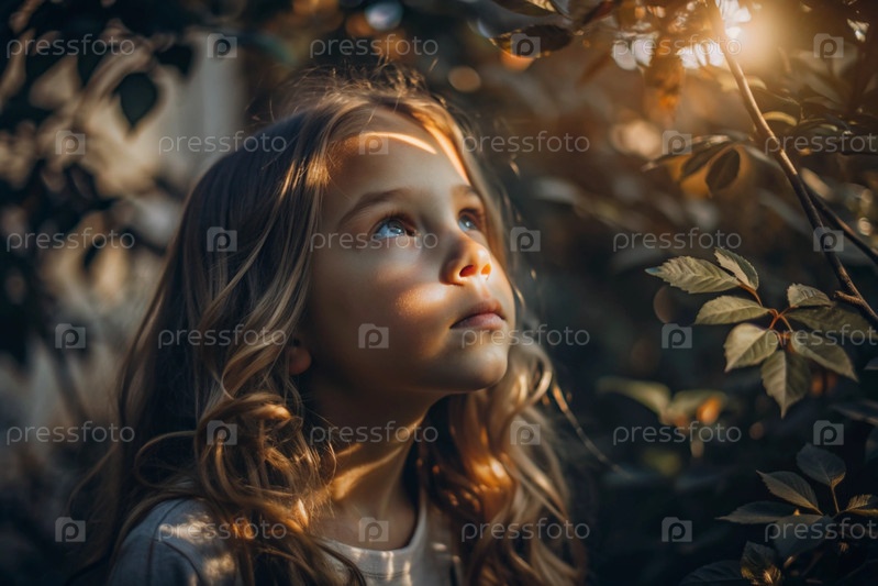 Красивый весенний портрет маленькой блондинки с кудрявыми волосами в лучах солнечного света природы