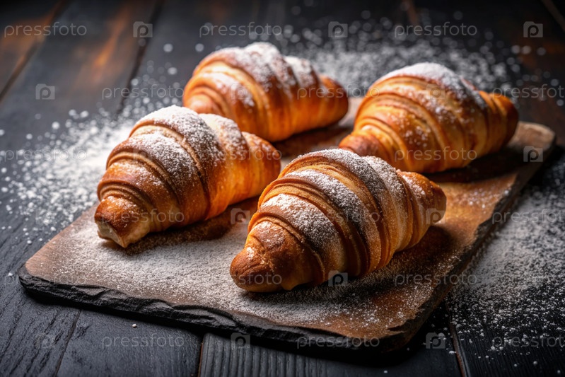 Вкусные свежевыпеченные кроассанты на тёмном фоне сланца. французский завтрак. хорошие ближневые выпечки. пекарня со вкусным хлебом. кондитерские изделия