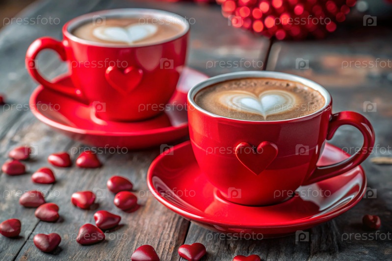 Концепция Дня святого Валентина для кафе и ресторанов красные чашки кофе латте с сердцами вокруг горячие напитки для влюбленных