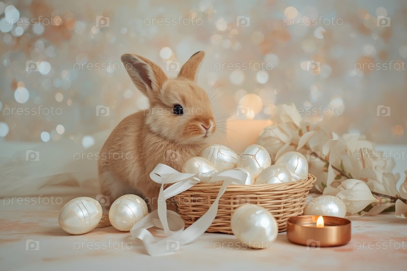 Концепция счастливых пасхальных праздников: нежные жемчужинные яйца в корзине, кролик и деликатные цветы на пастельном фоне