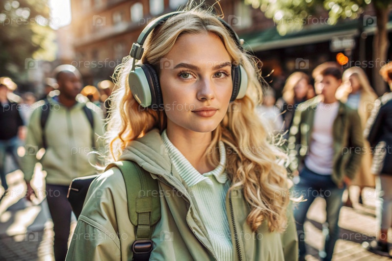Музыкальный любитель. молодая красивая кудрявая женщина с рюкзаком на фоне улицы и людей. Турист слушает музыку в наушниках и гуляет по городу