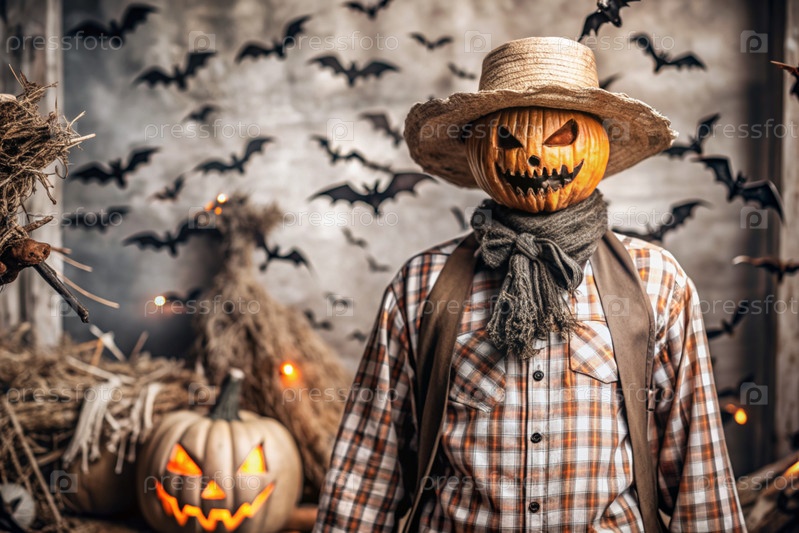 Концепция Хэллоуина. Ужасная. Страх. Устрашающий богий с тыквенной головой, квадратной рубашкой и бабочкой. Баннер, открытка