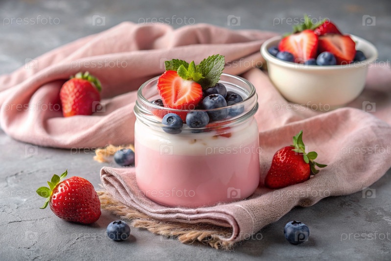 Домашний клубничный йогурт со свежими ягодами, винтажной ложкой и полотенцем на стильном сером фоне