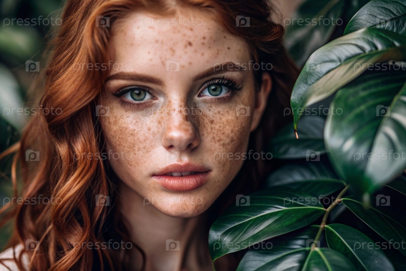 Глубокий эмоциональный портрет.Лицо молодой девушки без макияжа, с выразительными глазами, кудрявыми красными волосами и веснушками на лице. Естественная женская красота