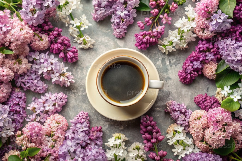 Красивая открытка. Кофейная чашка с тарелкой и лилой. Прекрасный натюрморт. Весна, лето. Концепция доброго утра