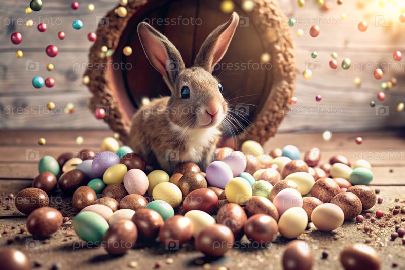 Известный праздник. милый пасхальный кролик заглядывает из ямы с красочными яйцами вокруг. концепция счастливой Пасхи