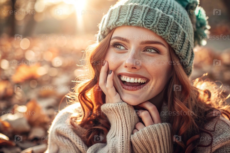 Осенний портрет. Близкий план молодой рыжеволосой женщины с ярко выраженными зелеными глазами в вязанной шляпе и свитере. Девушка смеется под лучами закатывающегося осеннего солнца