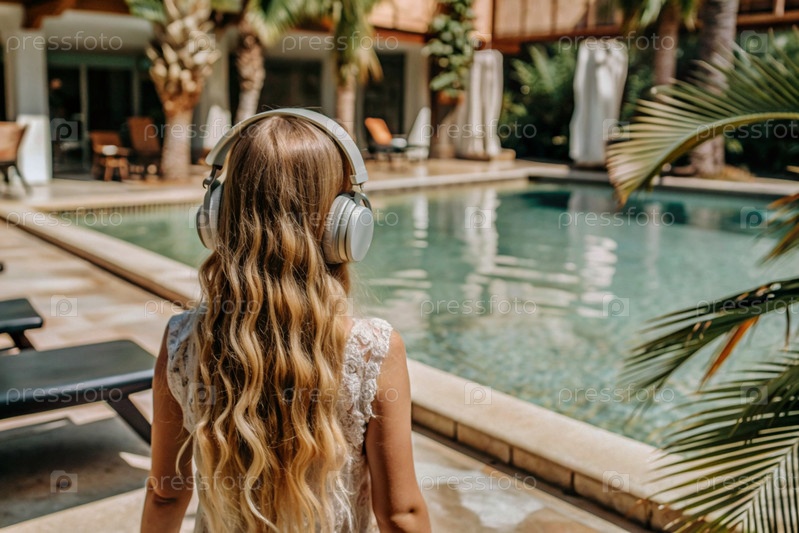 Молодая девушка слушает музыку с помощью больших наушников, стоит у бассейна спиной к камере