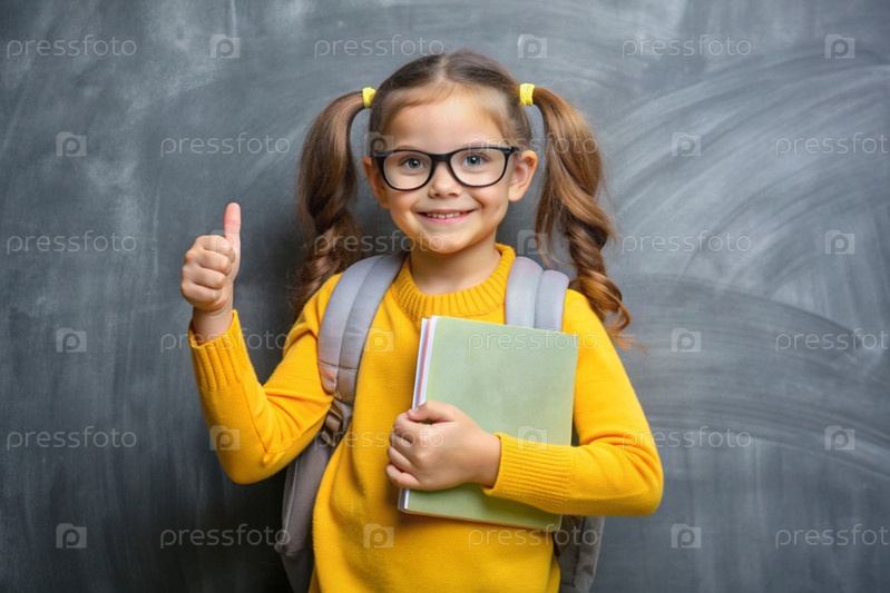 Красивая девушка в очках показывает класс своей рукой. Ребенок идет в школу впервые. Ребёнок с школьной сумкой и книгой. Ребенок в классе со доской на заднем плане. Назад в школу