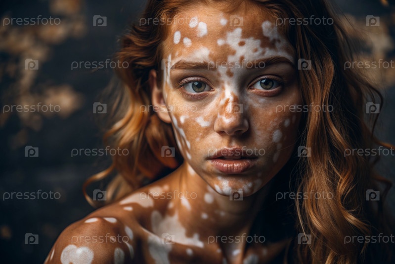 Лейкодермия. Витилиго. Плохая пигментация кожи. Большие белые пятна по всему телу и лицу. Портрет красивой девушки с кожными заболеваниями