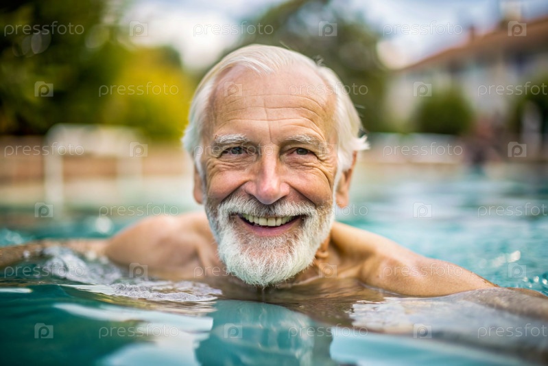 Пожилой мужчина плавает и занимается водной аэробикой в отопительном бассейне, счастливый и улыбающийся пенсионер