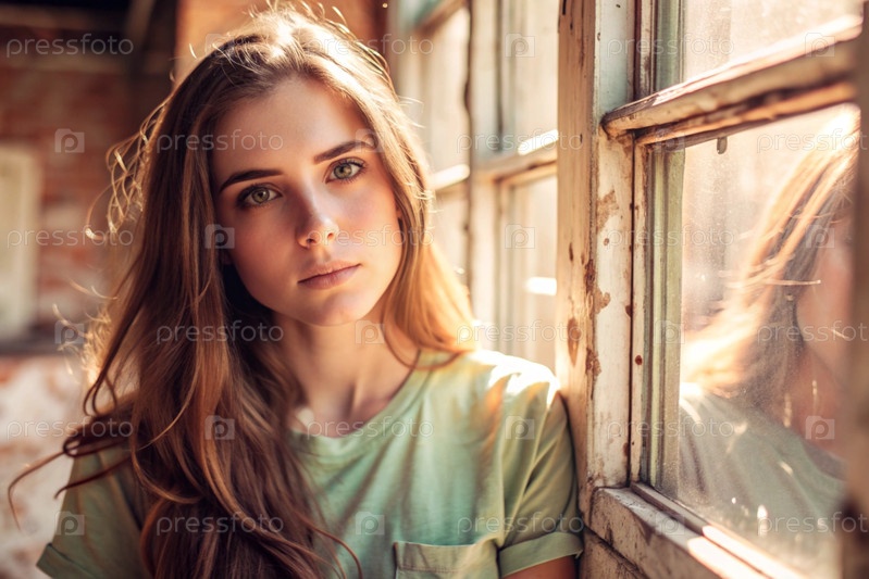 Портрет красивой девушки с кудрявыми волосами у окна старого дома, в котором светит теплое яркое солнце. Романтическое изображение. Одиночество, пустота и ожидание