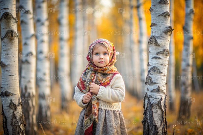 Русские народные традиции.Русский аромат.Красивая девочка в национальном русском платье и шаль в прекрасном березовом роще осенью.Портрет красивой девушки в березном лесу