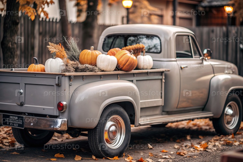 Осень, осенний дизайн.Большой урожай тыквы на заднем сиденье ретро-пикапа, крупный план