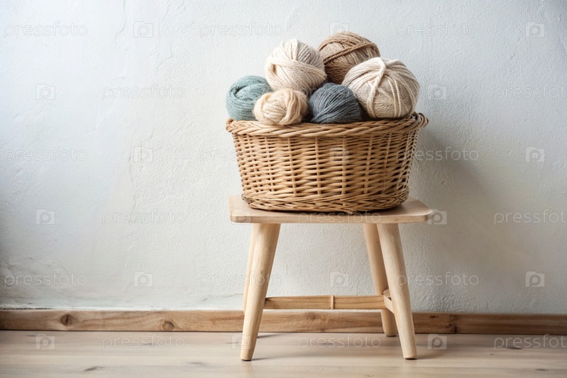 шарики пряжи в корзине из плесеня в белых и бежевых тонах швейная работа, текстиль, вязание зимний сезон, малый бизнес, ручная одежда