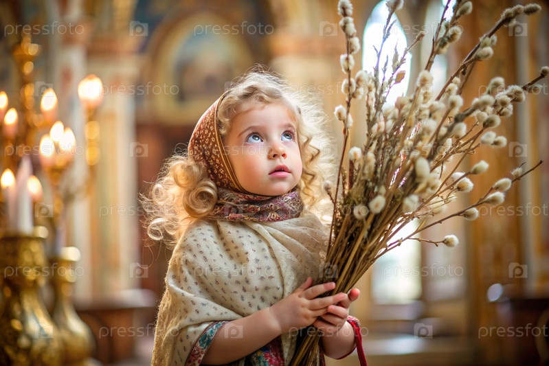 Пальмовое воскресенье. христианство. портрет трехлетней девочки в русском народном шале с ветвями ивы в руках на фоне православной церкви