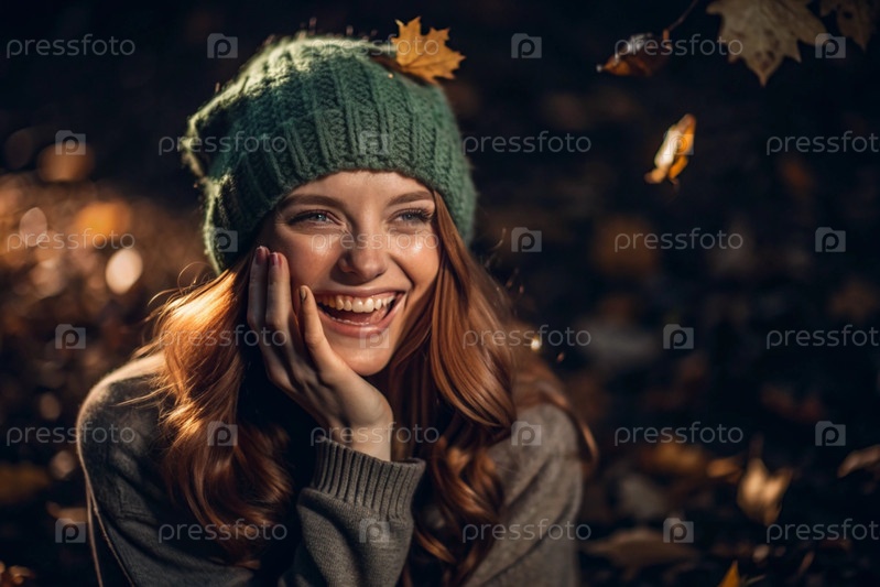 Осенний портрет. Близкий план молодой рыжеволосой женщины с ярко выраженными зелеными глазами в вязанной шляпе и свитере. Девушка смеется под лучами закатывающегося осеннего солнца
