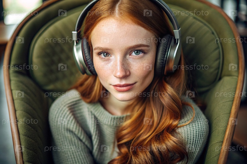 Молодая красивая рыжеволосая женщина с веснушками слушает музыку в больших беспроводных наушниках дома на стуле в гостиной