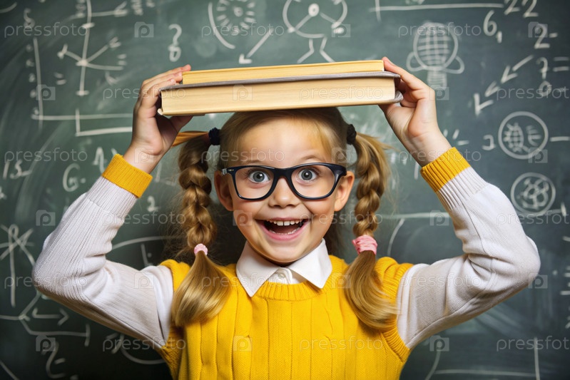 Красивая девушка с очками и книгами на голове. Ребенок впервые идет в школу. Ребёнок в классе со доской на заднем плане. Возвращение к школе