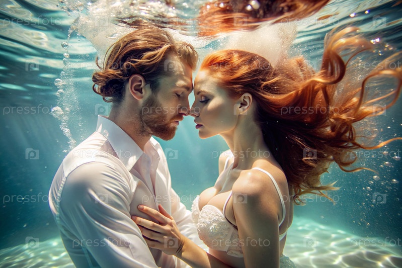Красивые влюбленные. мужчина и женщина под водой на глубине. романтические отношения. необычное свидание