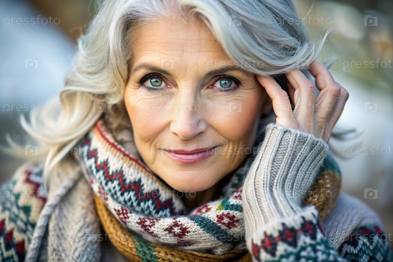 Осенний портрет красивой пожилой женщины, пенсионерки 70 лет. Она носит шарф с этническим узором и теплый свитер. Концепция жизни пожилых людей