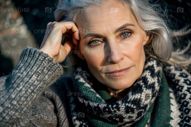 Осенний портрет красивой пожилой женщины, пенсионерки 70 лет. Она носит шарф с этническим узором и теплый свитер. Концепция жизни пожилых людей