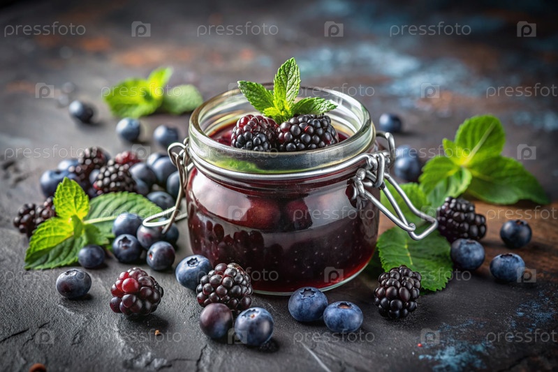 Банка домашней черники, здоровый варенье с мятой на чёрном фоне.Сохранение и уборка летом
