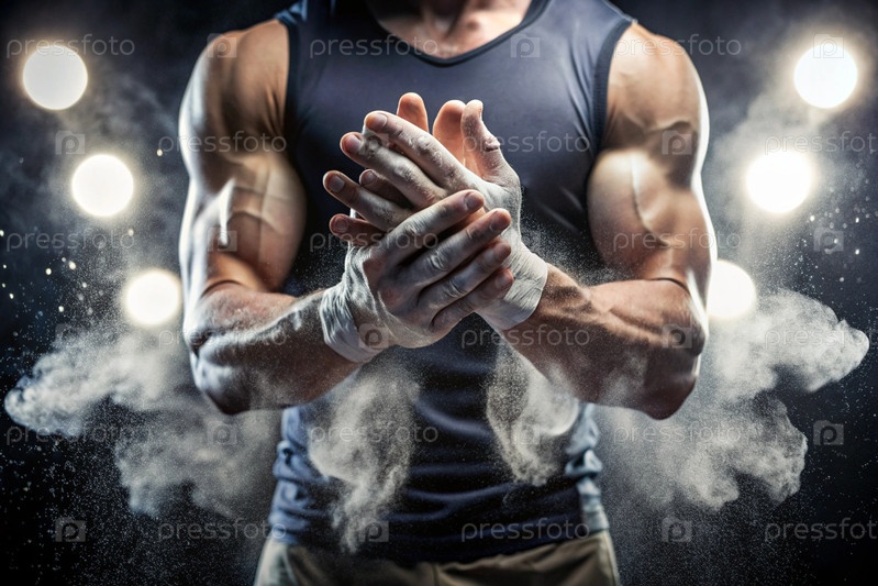 Соревнования по тяжелой атлетике Спортсмен обрабатывает свои руки мелом, прежде чем набирать много веса