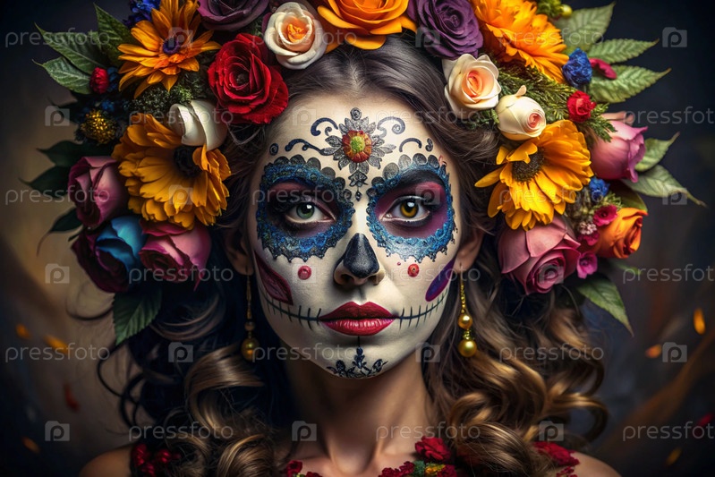 Концепция Хэллоуина. Ужасно. Костюмированная вечеринка. Красивая женщина с покрашенным черепом на лице и цветами на голове. Баннер, открытка