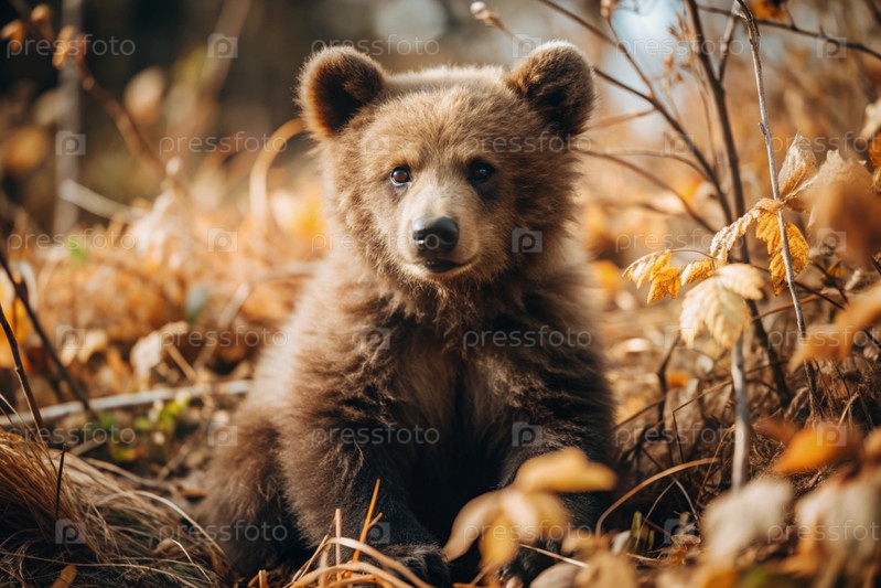Милый медвежончик, сидящий среди осеннего желтого листья.Охота на животных.Краснобойство