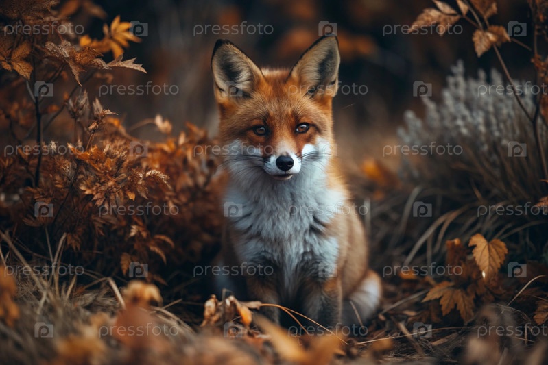 Красная лиса, сидящая среди осеннего листвы.Охота на животных